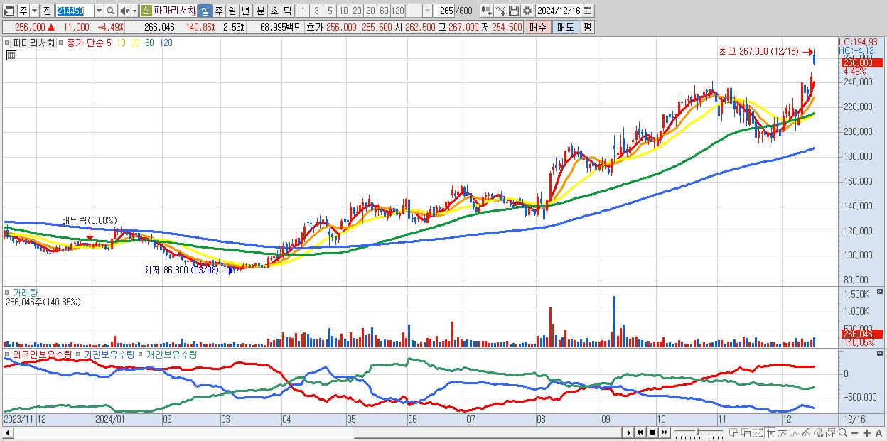 - 파마리서치 (256,000원 ▲ 4.49% , 시총: 26,905억, 거래량: 266,046, 거래대금:690억, KOSDAQ)