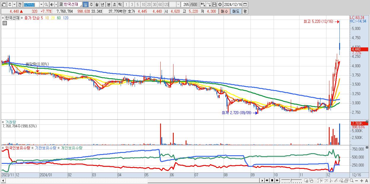 - 한국선재 (4,440원 ▲ 7.77% , 시총: 1,035억, 거래량: 7,768,784, 거래대금:378억, KOSDAQ)