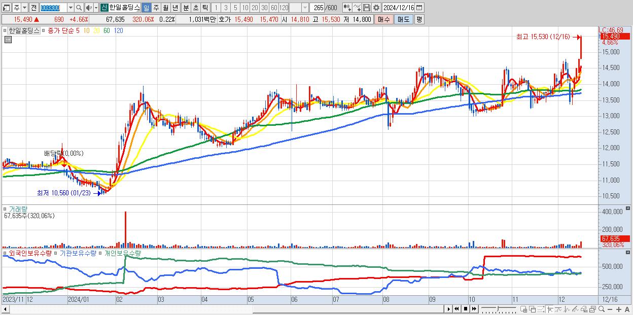 - 한일홀딩스 (15,490원 ▲ 4.66% , 시총: 4,776억, 거래량: 67,635, 거래대금:10억, KOSPI)