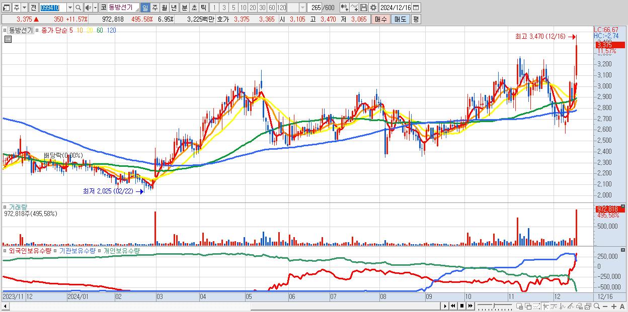 - 동방선기 (3,375원 ▲ 11.57% , 시총: 473억, 거래량: 972,818, 거래대금:32억, KOSDAQ)