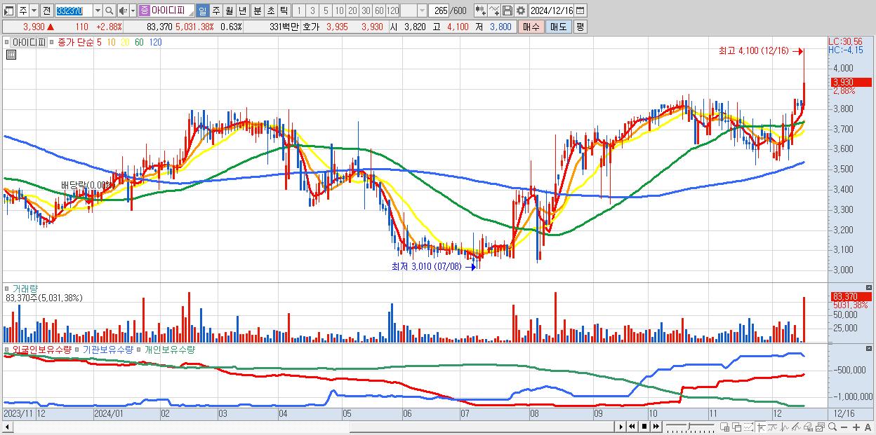 아이디피 3,930원 ▲ 2.88% (KOSDAQ, 332370)