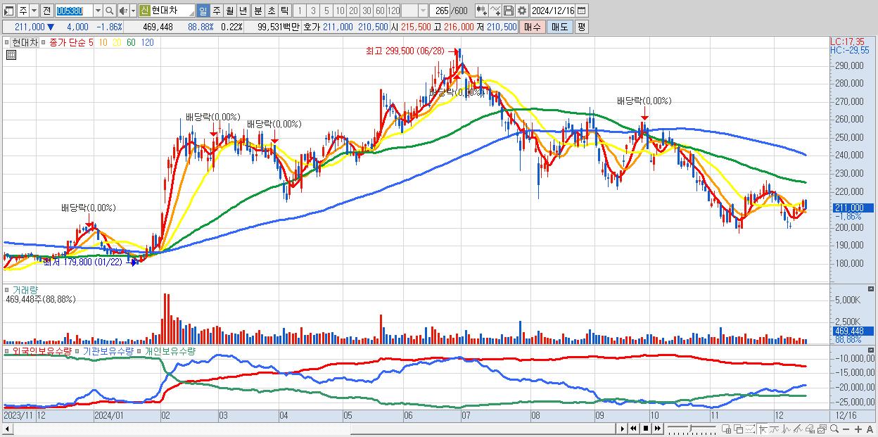 - 현대차 (211,000원 ▼ -1.86% , 시총: 441,868억, 거래량: 469,448, 거래대금:995억)