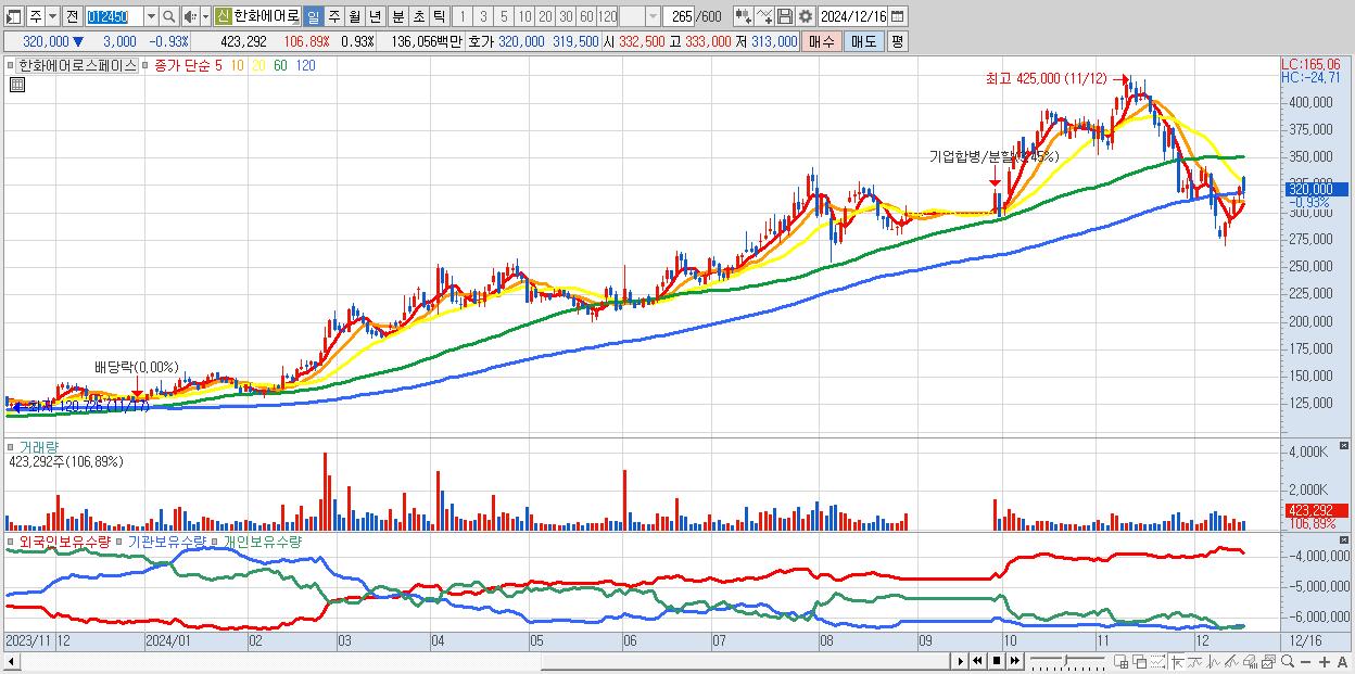 - 한화에어로스페이스 (320,000원 ▼ -0.93% , 시총: 145,860억, 거래량: 423,292, 거래대금:1,361억)