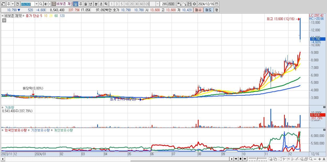 - 비보존 제약 (10,790원 ▼ -4.6% , 시총: 5,406억, 거래량: 8,543,400, 거래대금:971억)