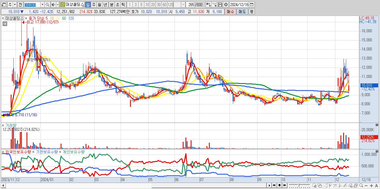 - 대상홀딩스 (10,010원 ▼ -12.42% , 시총: 3,625억, 거래량: 12,251,902, 거래대금:1,273억)