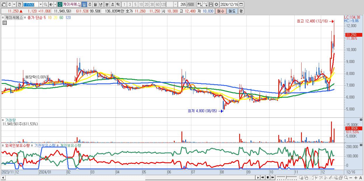 - 케이씨에스 (11,250원 ▲ 11.06% , 시총: 1,350억, 거래량: 11,949,561, 거래대금:1,368억)