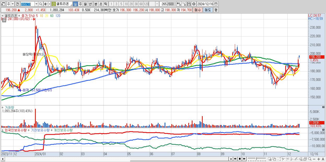 - 셀트리온 (196,200원 ▲ 1.45% , 시총: 425,908억, 거래량: 1,093,284, 거래대금:2,144억)
