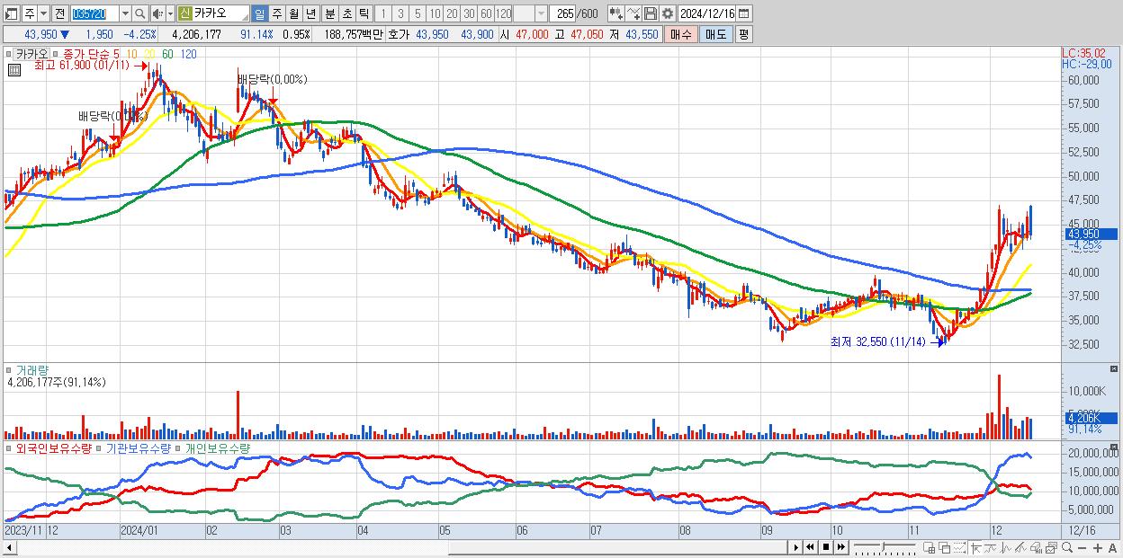 - 카카오 (43,950원 ▼ -4.25% , 시총: 194,946억, 거래량: 4,206,177, 거래대금:1,888억)