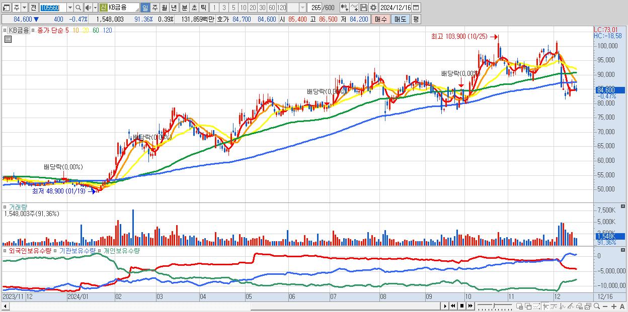 - KB금융 (84,600원 ▼ -0.47% , 시총: 332,925억, 거래량: 1,548,003, 거래대금:1,319억)
