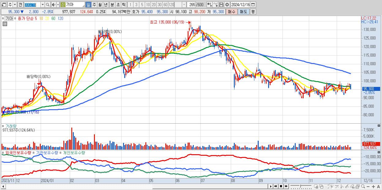- 기아 (95,300원 ▼ -2.85% , 시총: 378,982억, 거래량: 977,937, 거래대금:942억)