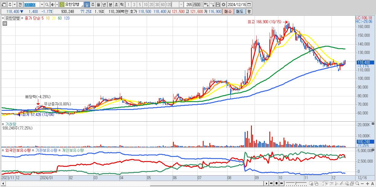 - 유한양행 (118,400원 ▼ -1.17% , 시총: 94,968억, 거래량: 930,248, 거래대금:1,104억)
