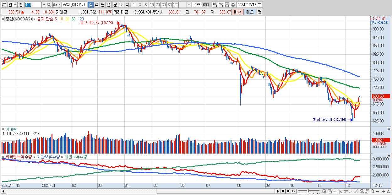 | 12/16 | 698.53 | ▲0.69% | 2,089억 | -1,147억 | -774억 | -168억 |
