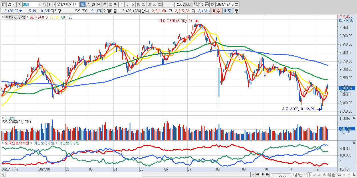 | 12/16 | 2,488.97 | ▼-0.22% | 3,668억 | -4,321억 | 1억 | 652억 |