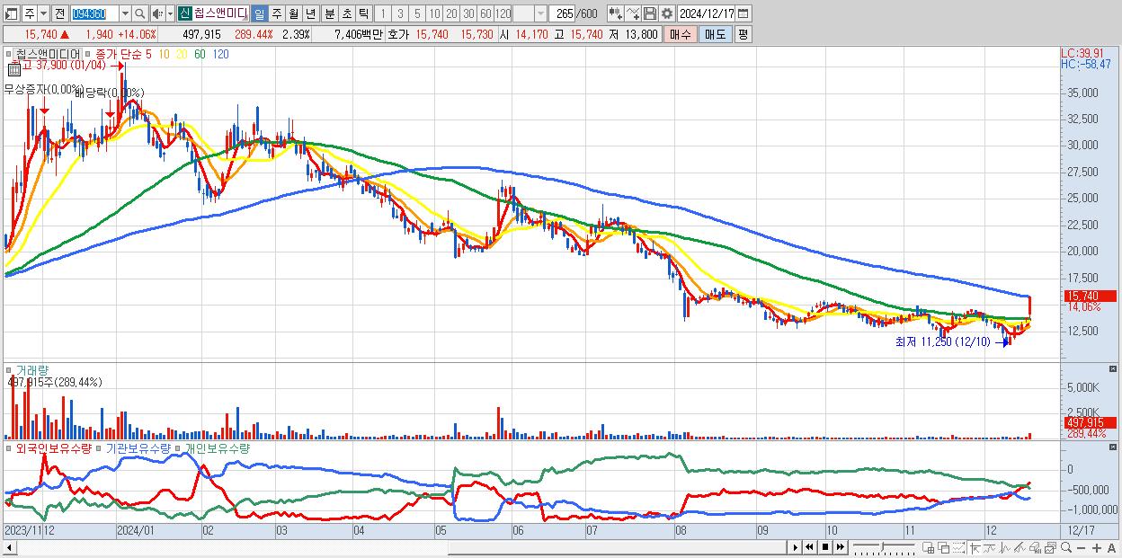 - 칩스앤미디어 (15,740원 ▲ 14.06% , 시총: 3,278억, 거래량: 497,915, 거래대금:74억)