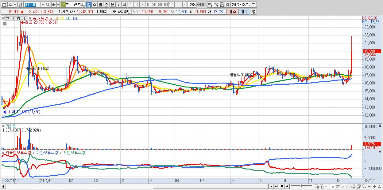 - 한국앤컴퍼니 (19,990원 ▲ 13.84% , 시총: 18,978억, 거래량: 1,807,438, 거래대금:365억)