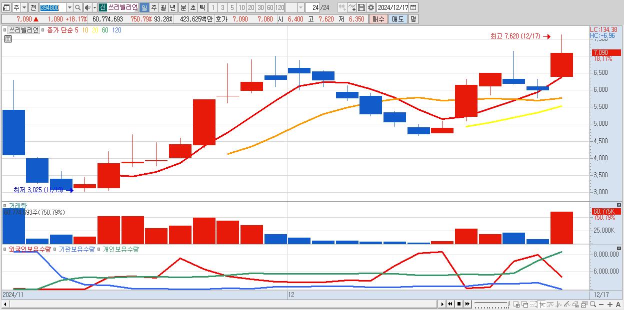 - 쓰리빌리언 (7,090원 ▲ 18.17% , 시총: 2,229억, 거래량: 60,774,693, 거래대금:4,236억)