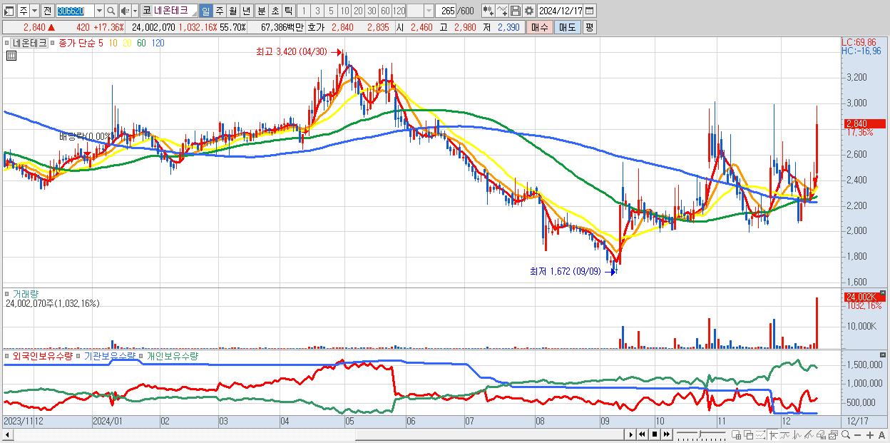 - 네온테크 (2,840원 ▲ 17.36% , 시총: 1,224억, 거래량: 24,002,070, 거래대금:674억)