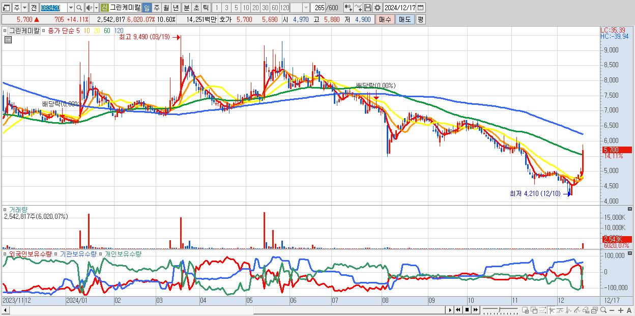 - 그린케미칼 (5,700원 ▲ 14.11% , 시총: 1,368억, 거래량: 2,542,817, 거래대금:143억)