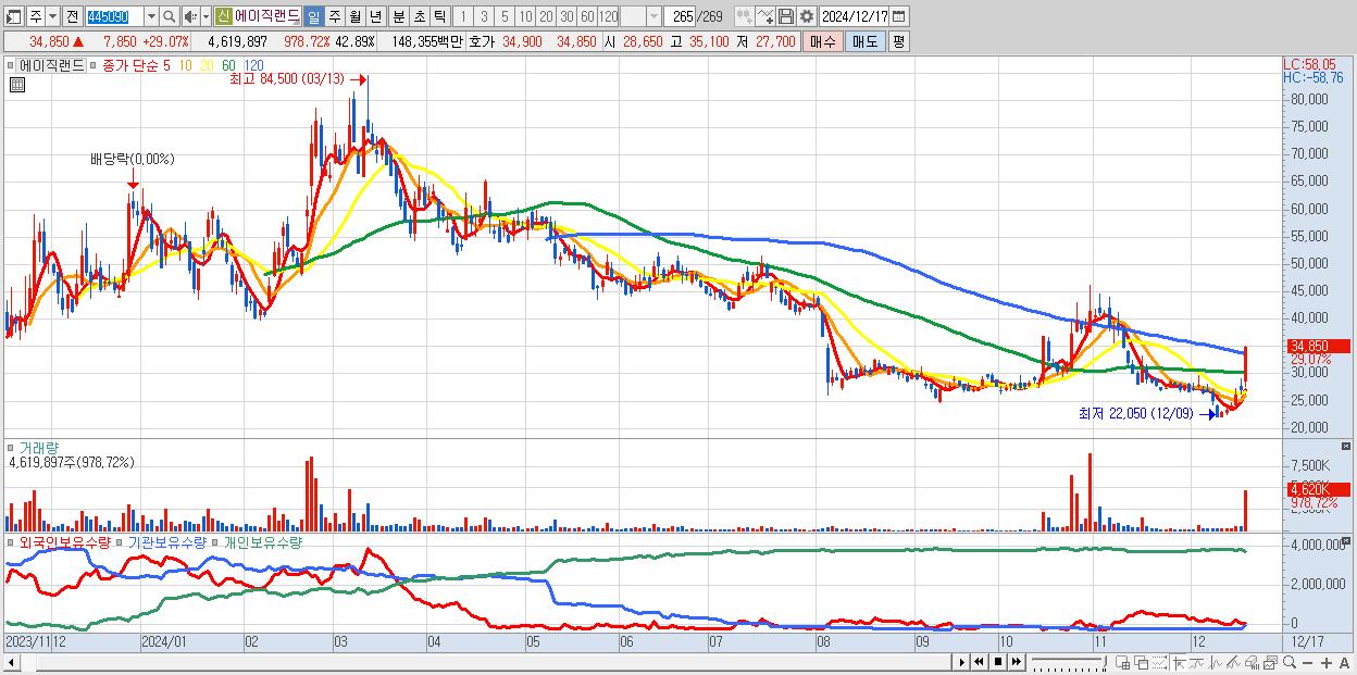 - 에이직랜드 (34,850원 ▲ 29.07% , 시총: 3,754억, 거래량: 4,619,897, 거래대금:1,484억)