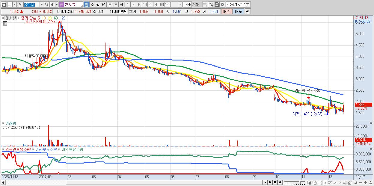 - 센서뷰 (1,862원 ▲ 19.05% , 시총: 491억, 거래량: 6,071,268, 거래대금:110억)