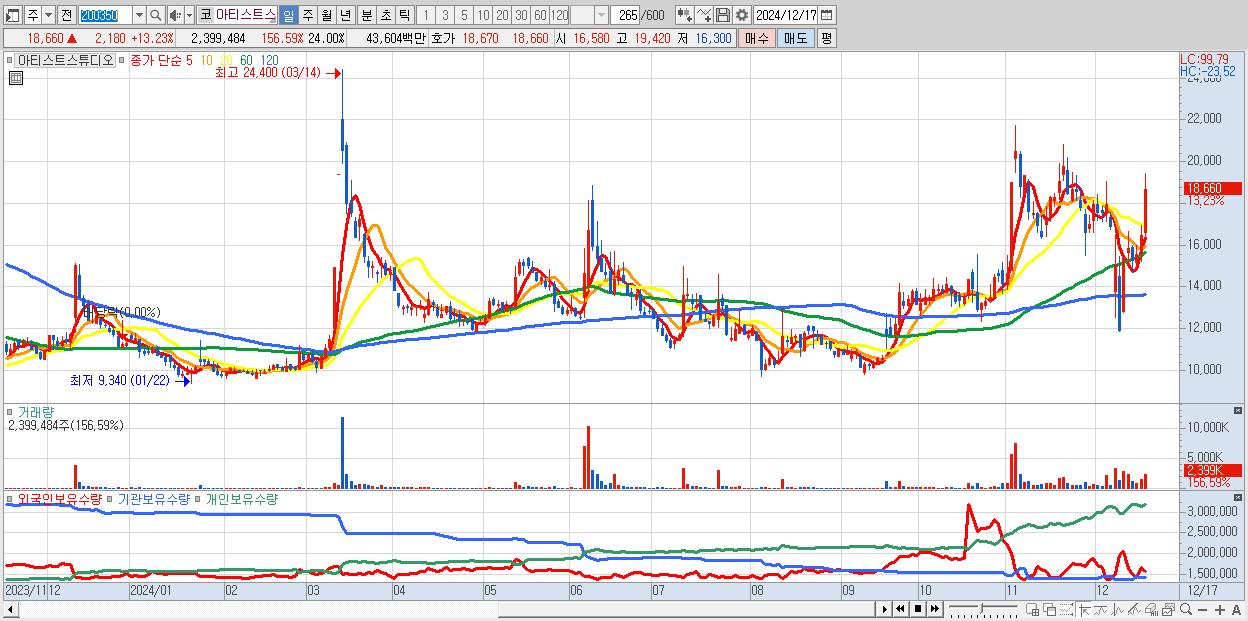- 아티스트스튜디오 (18,660원 ▲ 13.23% , 시총: 1,865억, 거래량: 2,399,484, 거래대금:436억)