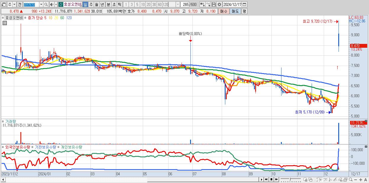 - 효성오앤비 (8,470원 ▲ 13.24% , 시총: 719억, 거래량: 11,716,871, 거래대금:1,057억)
