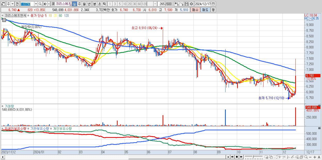 - 크리스에프앤씨 (6,740원 ▲ 13.85% , 시총: 1,579억, 거래량: 548,699, 거래대금:37억)