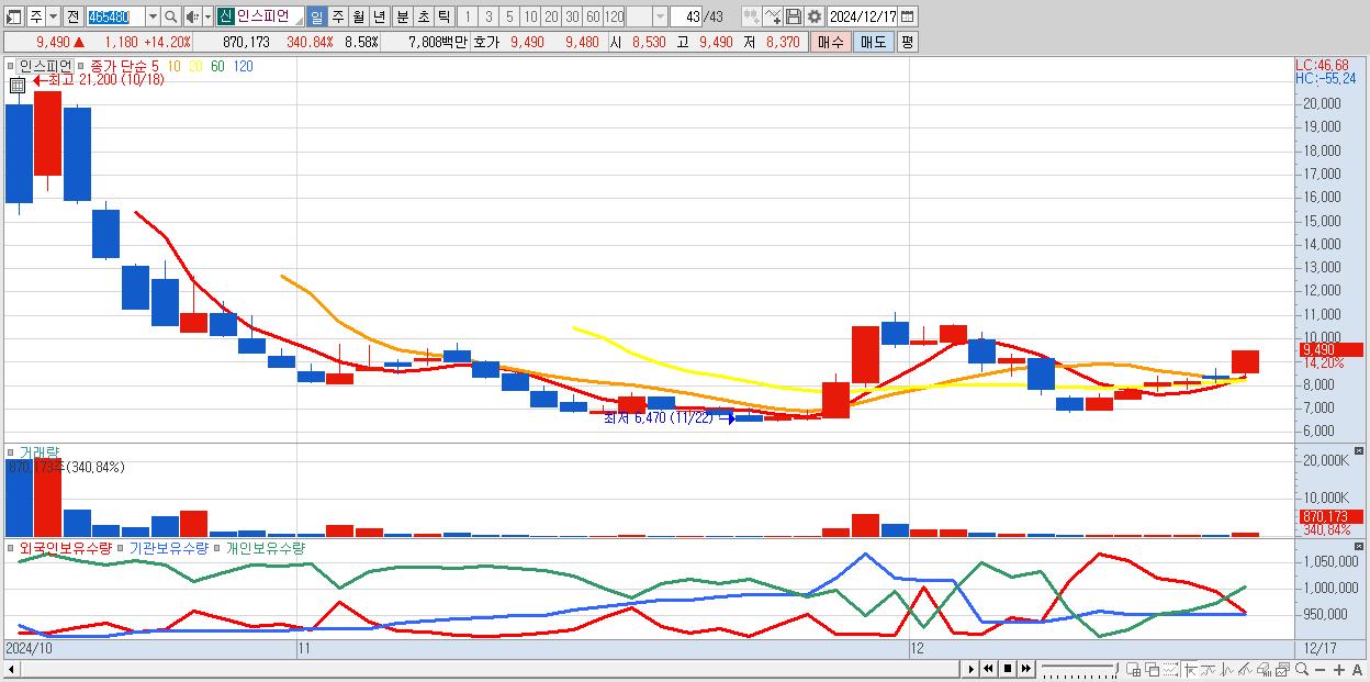 - 인스피언 (9,490원 ▲ 14.2% , 시총: 962억, 거래량: 870,173, 거래대금:78억)
