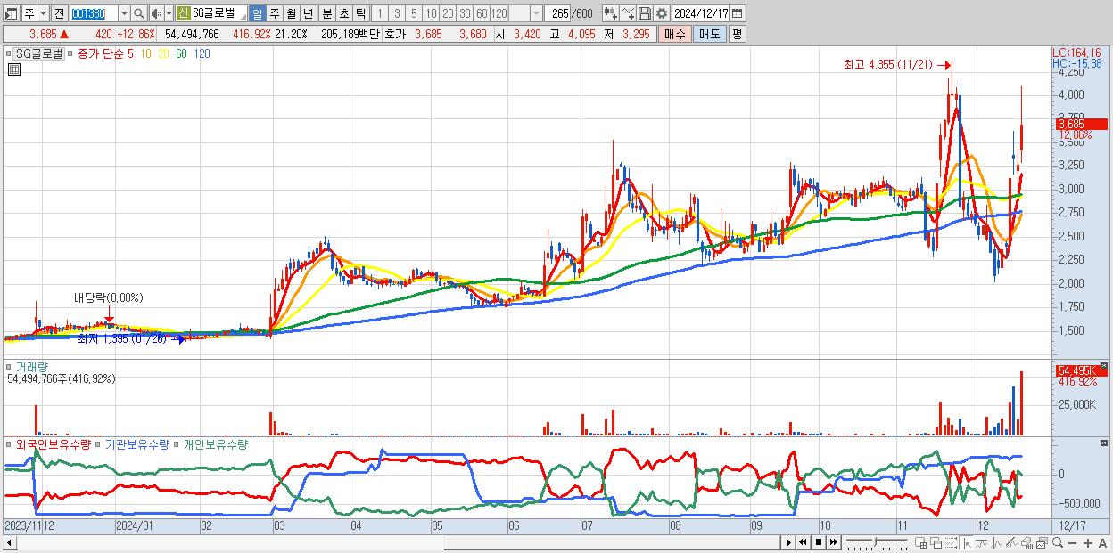 - SG글로벌 (3,685원 ▲ 12.86% , 시총: 1,657억, 거래량: 54,494,766, 거래대금:2,052억)