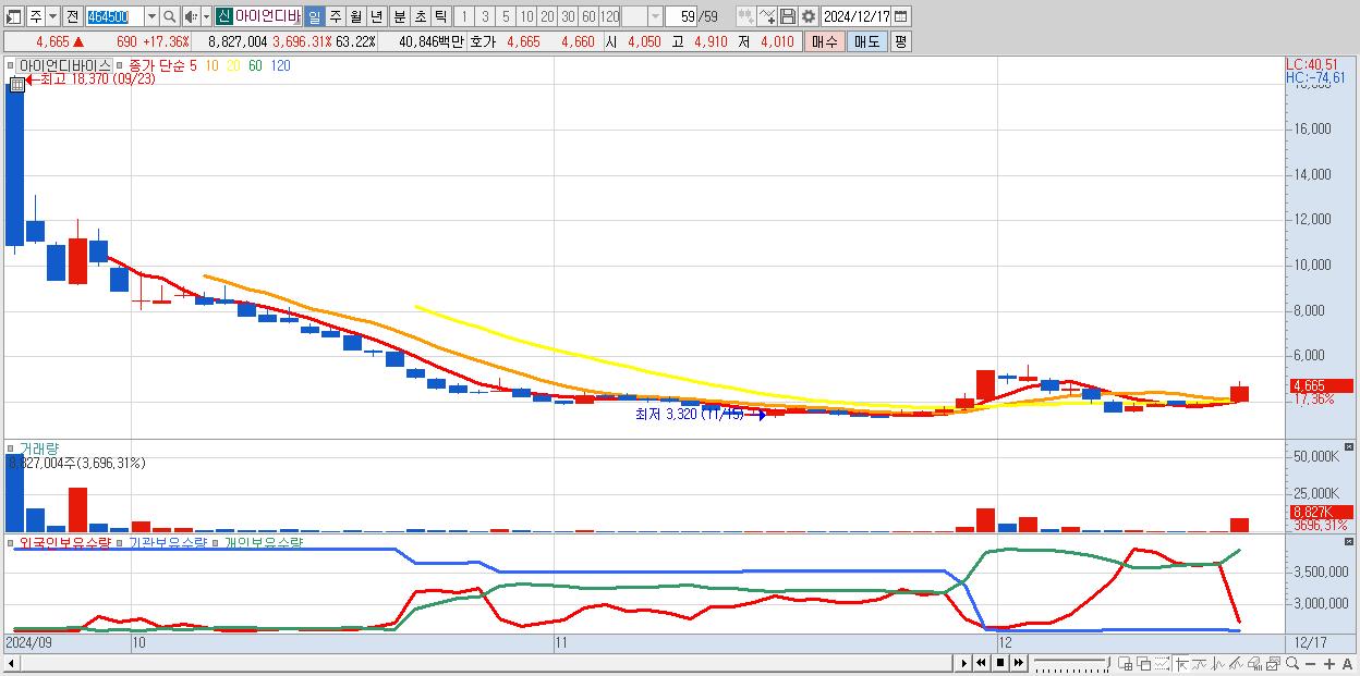 - 아이언디바이스 (4,665원 ▲ 17.36% , 시총: 651억, 거래량: 8,827,004, 거래대금:408억)