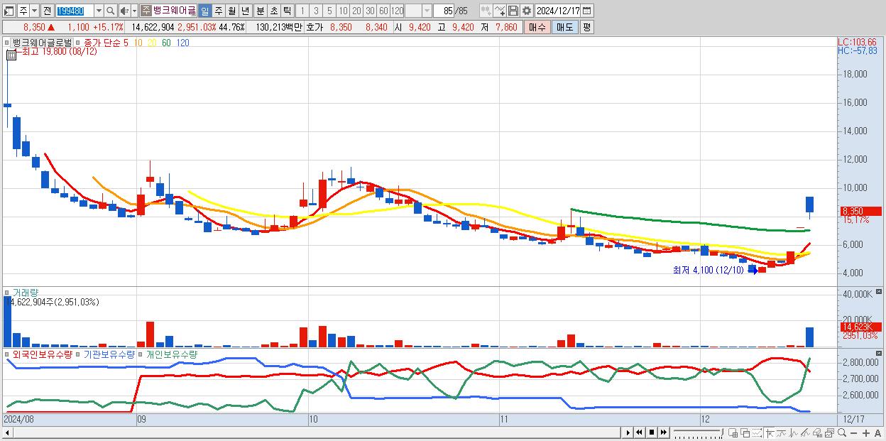 - 뱅크웨어글로벌 (8,350원 ▲ 15.17% , 시총: 843억, 거래량: 14,622,904, 거래대금:1,302억)