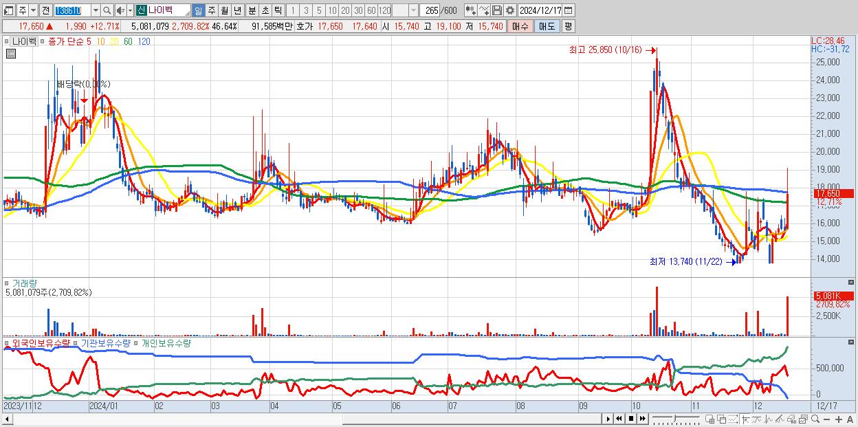 - 나이벡 (17,650원 ▲ 12.71% , 시총: 1,923억, 거래량: 5,081,079, 거래대금:916억)