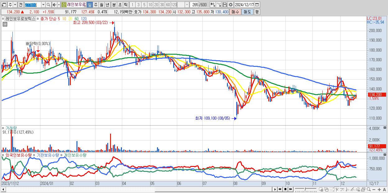 - 레인보우로보틱스 (134,200원 ▲ 1.59% , 시총: 26,035억, 외국인 순매수 거래금:17억)