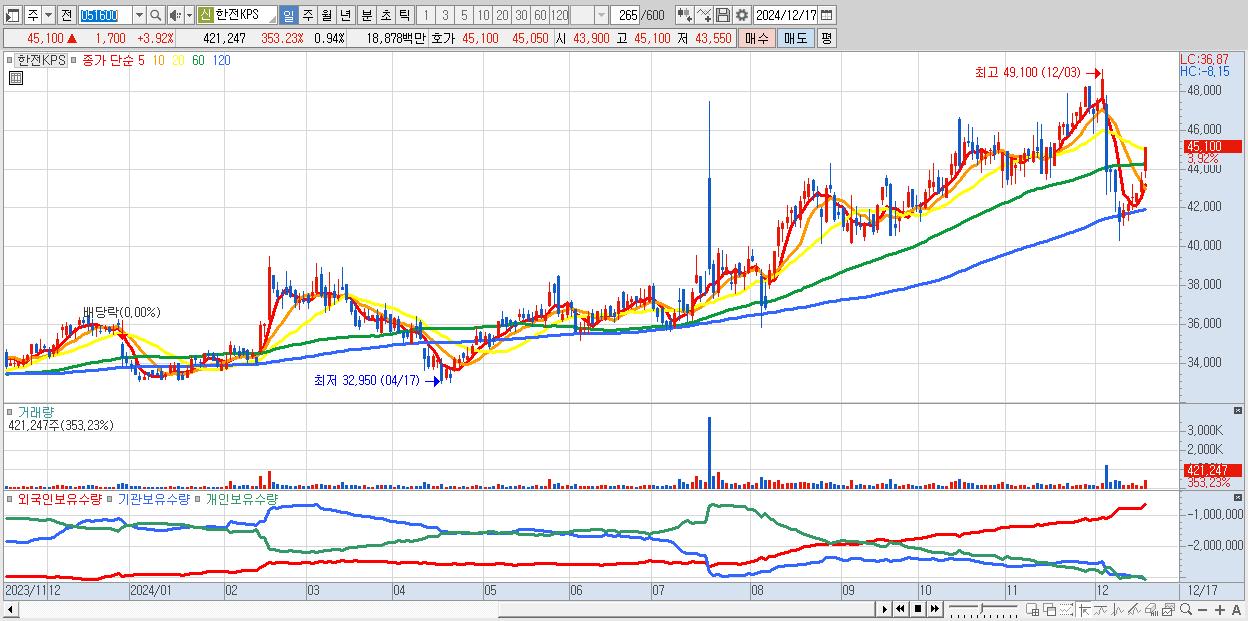 - 한전KPS (45,100원 ▲ 3.92% , 시총: 20,295억, 외국인 순매수 거래금:68억)