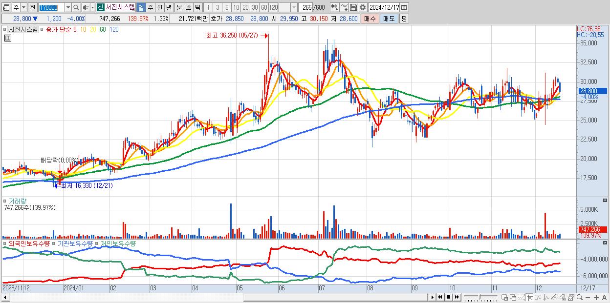 - 서진시스템 (28,800원 ▼ -4% , 시총: 16,199억, 외국인 순매수 거래금:26억)