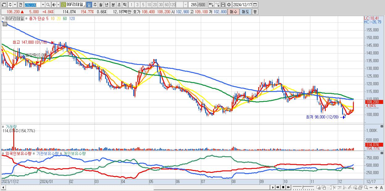 - BGF리테일 (108,200원 ▲ 4.84% , 시총: 18,701억, 외국인 순매수 거래금:24억)