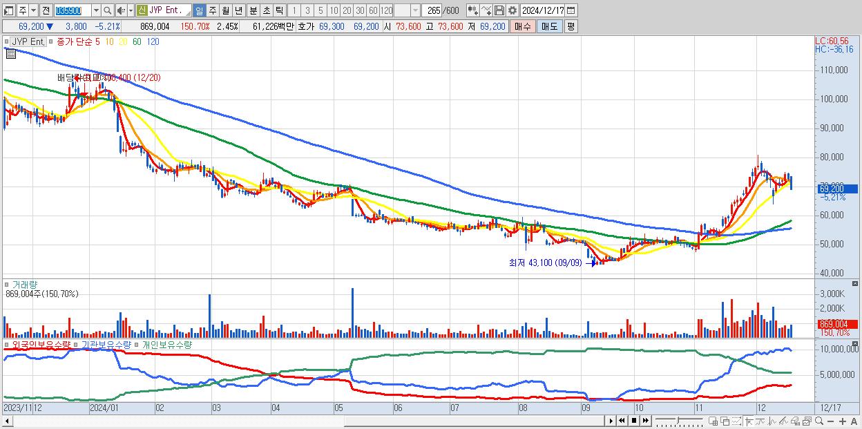 - JYP Ent. (69,200원 ▼ -5.21% , 시총: 24,588억, 외국인 순매수 거래금:75억)