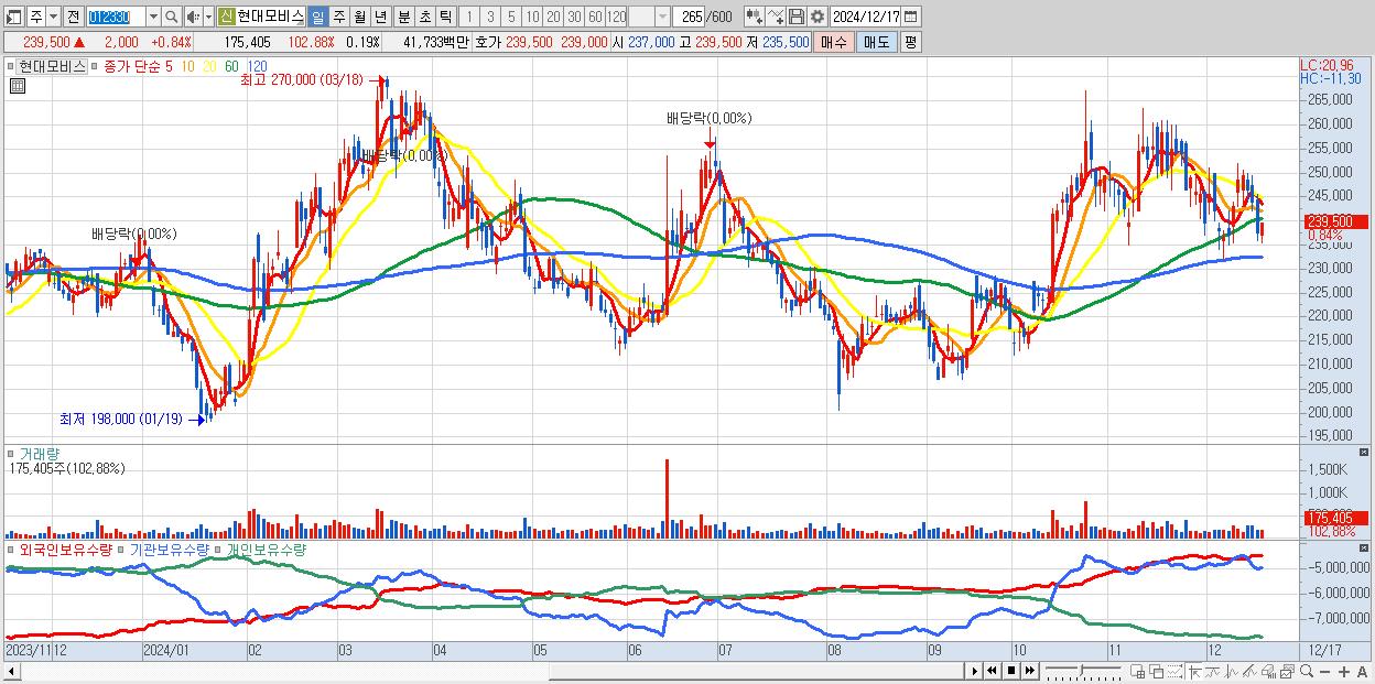 - 현대모비스 (239,500원 ▲ 0.84% , 시총: 222,723억, 외국인 순매수 거래금:15억)