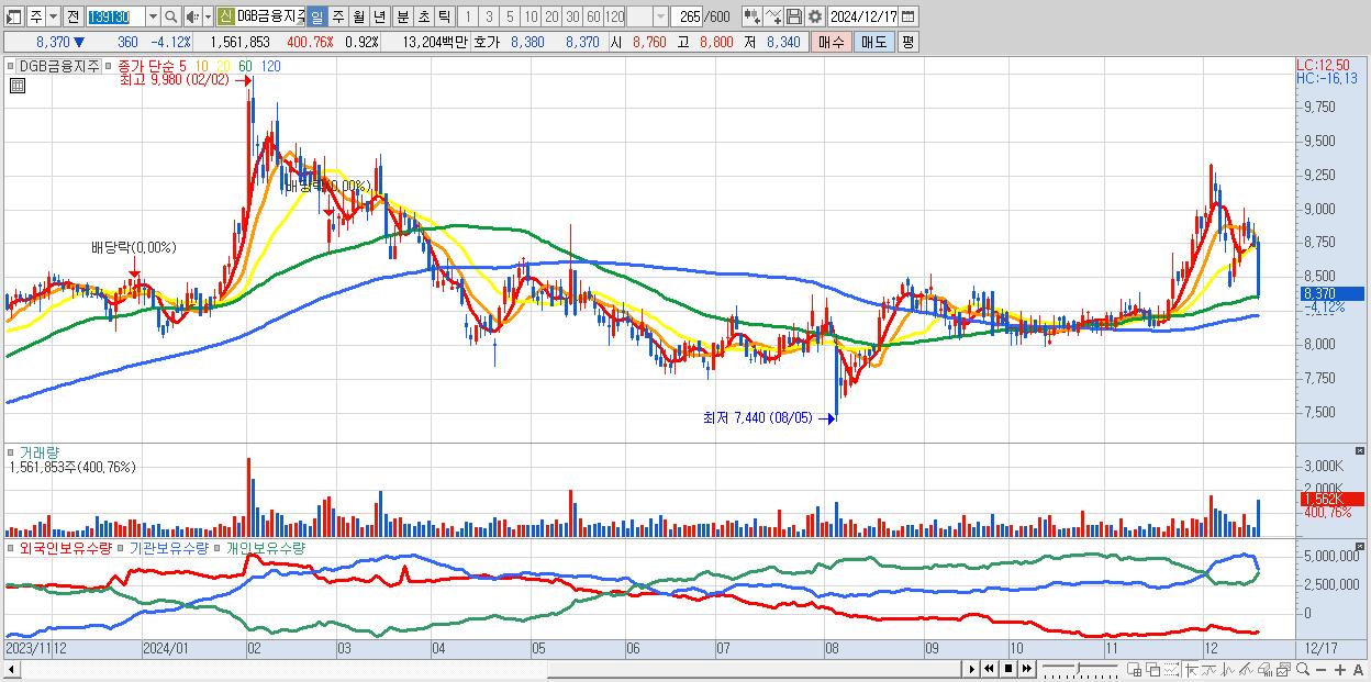- DGB금융지주 (8,370원 ▼ -4.12% , 시총: 14,158억, 외국인 순매수 거래금:17억)