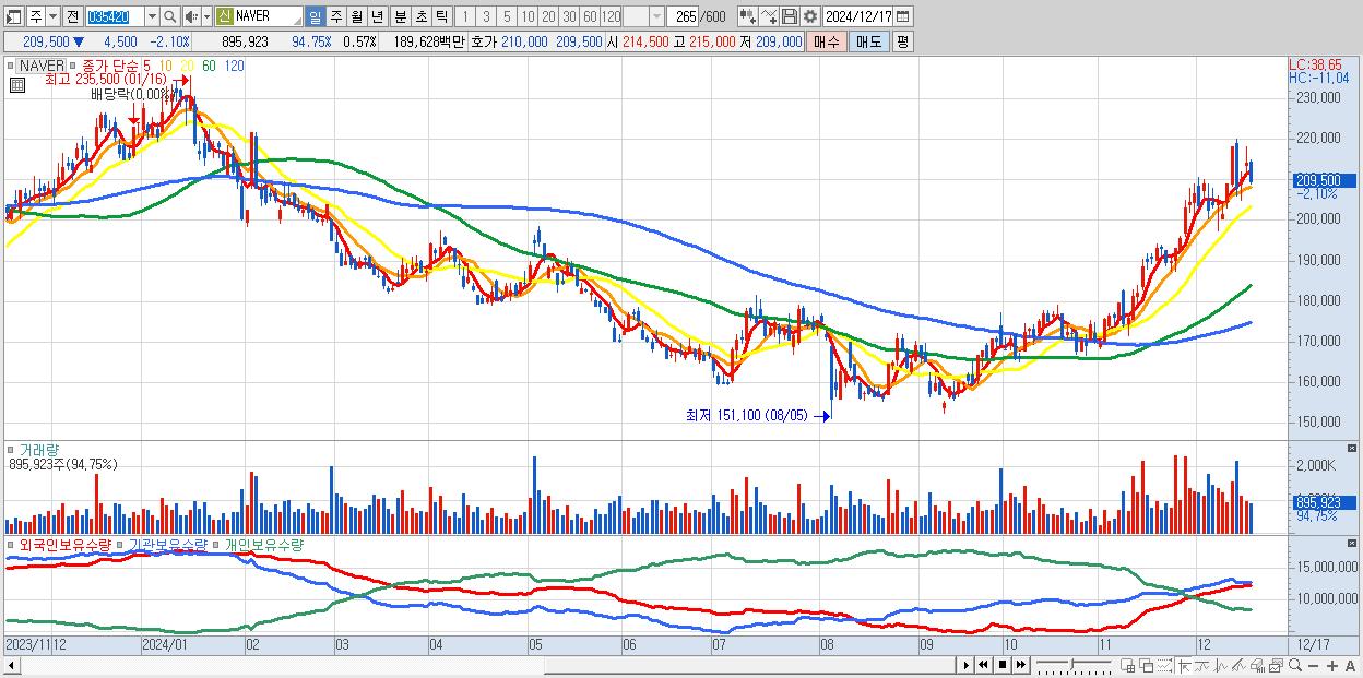 - NAVER (209,500원 ▼ -2.1% , 시총: 331,926억, 외국인 순매수 거래금:63억)