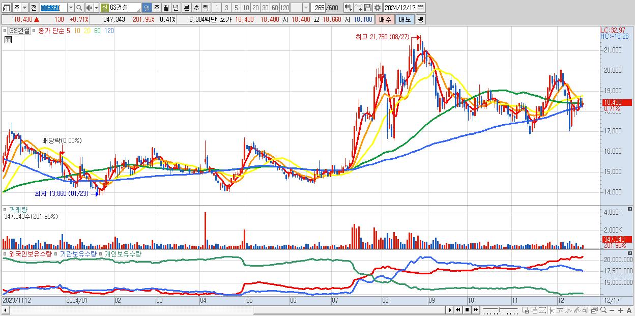 - GS건설 (18,430원 ▲ 0.71% , 시총: 15,773억, 외국인 순매수 거래금:21억)