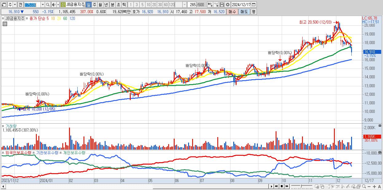 - JB금융지주 (16,910원 ▼ -3.15% , 시총: 32,989억, 외국인 순매수 거래금:49억)