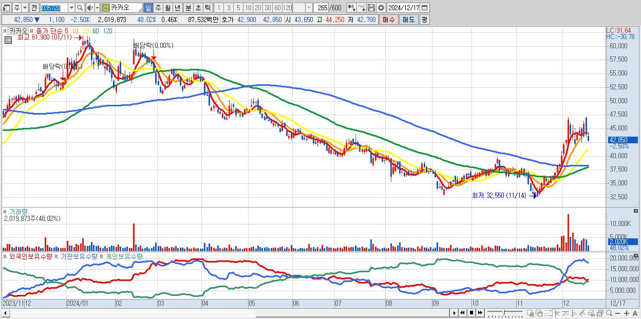 - 카카오 (42,850원 ▼ -2.5% , 시총: 190,067억, 외국인 순매수 거래금:73억)