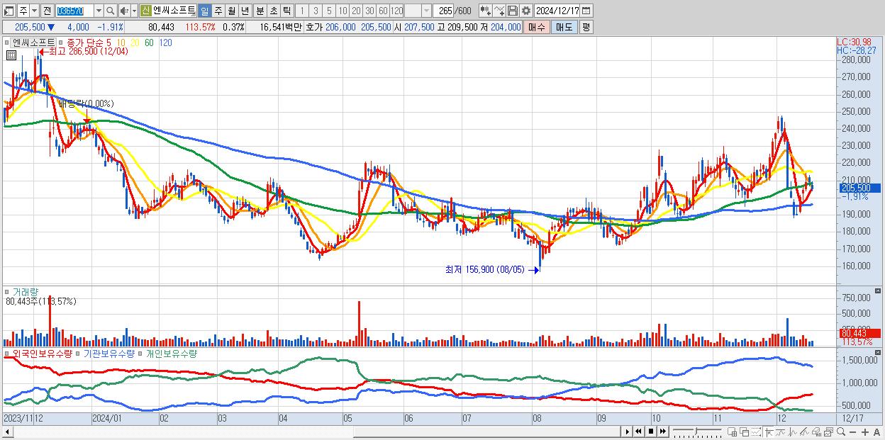 - 엔씨소프트 (205,500원 ▼ -1.91% , 시총: 45,116억, 외국인 순매수 거래금:21억)