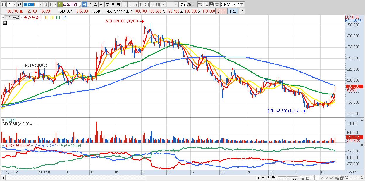 - 리노공업 (188,700원 ▲ 6.85% , 시총: 28,762억, 외국인 순매수 거래금:19억)