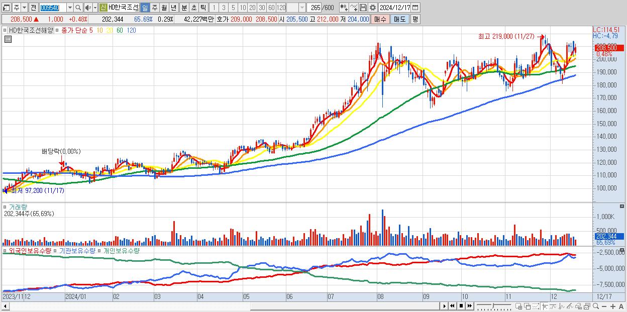 - HD한국조선해양 (208,500원 ▲ 0.48% , 시총: 147,562억, 외국인 순매수 거래금:29억)