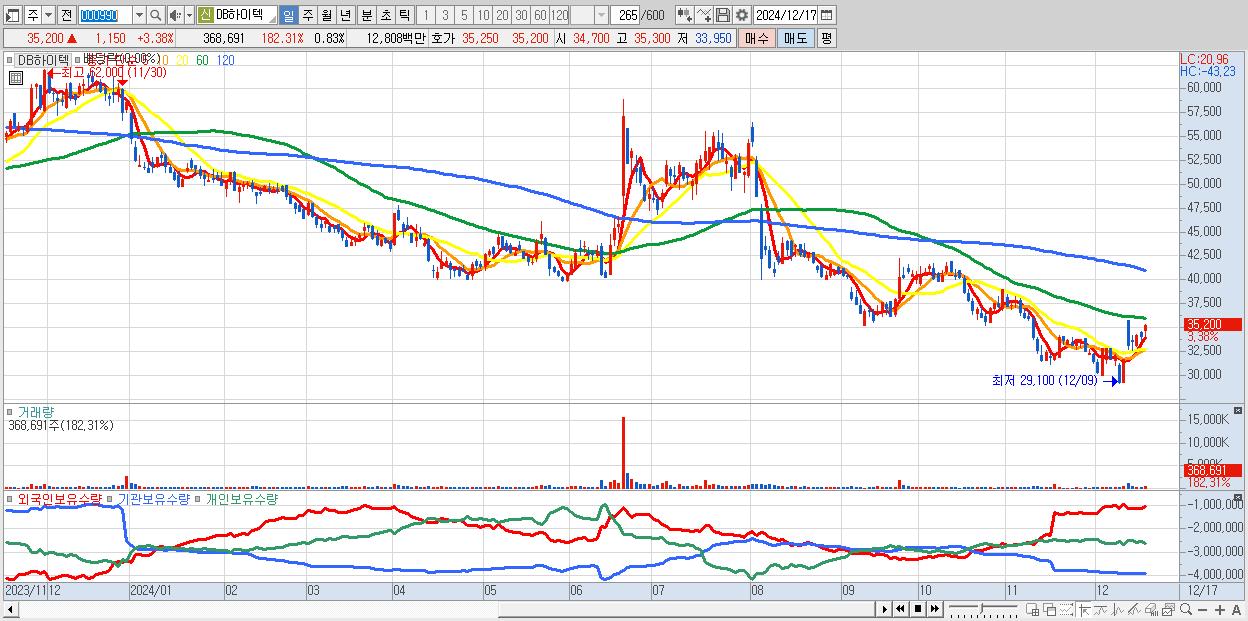 - DB하이텍 (35,200원 ▲ 3.38% , 시총: 15,628억, 외국인 순매수 거래금:20억)
