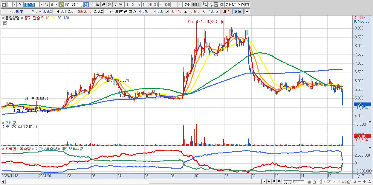- 동양생명 (4,640원 ▼ -13.75% , 시총: 7,487억, 외국인 순매수 거래금:22억)