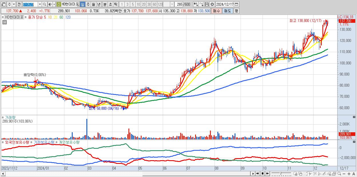 - HD현대미포 (137,700원 ▲ 1.77% , 시총: 55,000억, 거래량: 289,901, 거래대금:398억, KOSPI)