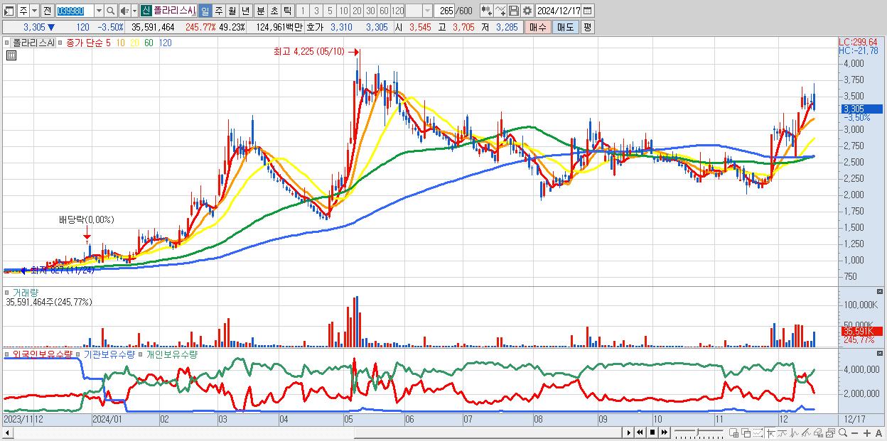 - 폴라리스AI (3,305원 ▼ -3.5% , 시총: 2,389억, 거래량: 35,591,464, 거래대금:1,250억)